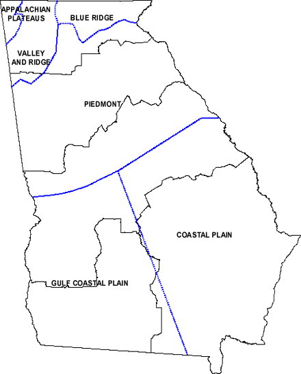 For example, the map in Figure 3 would be displayed by clicking on the "P" at the bottom of the blue column located at the far right of Figure 2A. Unique information for a Physiographic region (delineated by the blue lines on this map) will be displayed in the information box whenever the mouse is placed over any given region.