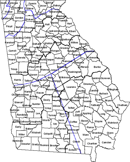 Dade Walker Catoosa Whitfield Murray Chattooga Floyd Gordon Bartow Polk Fannin Gilmer Pickens Union Towns Rabun Habersham White Lumpkin Dawson Forsyth Cherokee Decatur Grady Stephens Franklin Hall Banks Hart Fulton Dekalb Gwinnett Cobb Douglas Clayton Henry Rockdale Paulding Fayette Haralson Carroll Coweta Spalding Butts Newton Walton Barrow Jackson Madison Oglethorpe Oconee Clarke Elbert Lincoln Wilkes Heard Troup Harris Muscogee Chattahoochee Stewart Quitman Clay Early Seminole Miller Chatham Bryan Liberty McIntosh Bacon Glynn Camden Charlton Ware Pierce Brantley Wayne Long Effingham Screven Burke Richmond Columbia McDuffie Warren Glascock Jefferson Thomas Brooks Lowndes Echols Clinch Lanier Dodge Telfair Wheeler Laurens Bleckley Pulaski Wilcox Ben Hill Irwin Turner Crisp Dooly Houston Twiggs Wilkinson Johnson Treutlen Montgomery Jeff Davis Coffee Atkinson Berrien Tift Worth Lee Sumter Macon Peach Bibb Jones Baldwin Washington Hancock Taliaferro Greene Morgan Putnam Jasper Monroe Crawford Taylor Schley Webster Dougherty Baker Mitchell Colquitt Cook Meriwether Pike Lamar Upson Talbot Marion Terrell Randolph Calhoun Appling Tattnall Toombs Evans Candler Emanuel Jenkins Bulloch